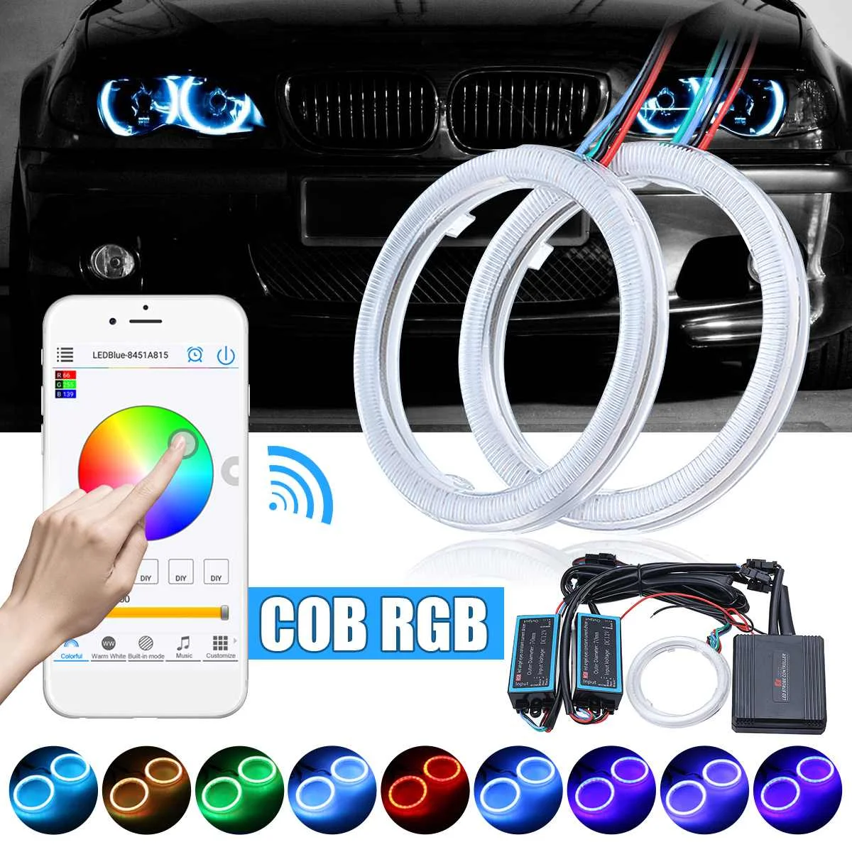 Related Product for 1Pair bluetooth Wireless APP Control RGB COB Angel Eyes Led Halo Rings Light COB 70 LED Chips Multi